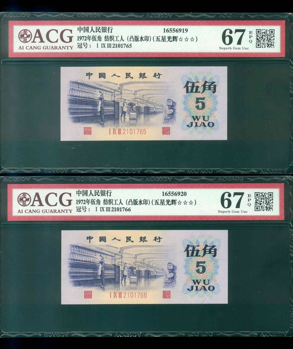 1972 中國人民銀行 伍角 ACG 67 EPQ 編號:I IX III 2101765-66(共2張,凸版連號)