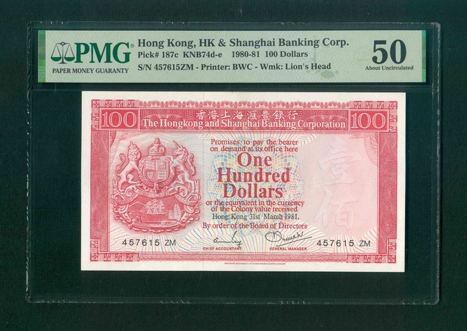1981 香港上海匯豐銀行$100 PMG 50 編號: 457615ZM