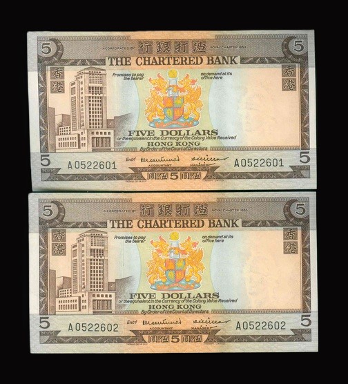 1975ND 香港渣打銀行 $5 EF 編號:A0522601-02(共2張,連號)