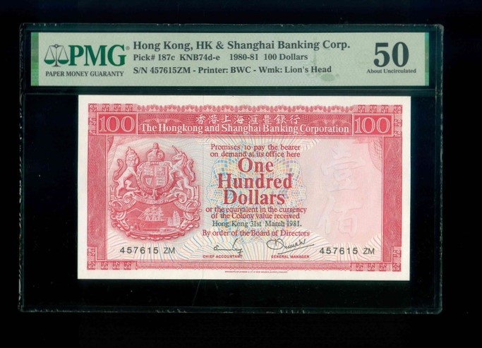 1981 香港上海滙豐銀行 $100 PMG 50 編號:457615 ZM