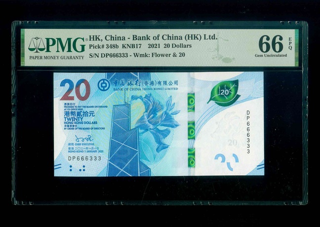 2021 香港中國銀行 $20 PMG 66 EPQ 編號:DP666333(雙豹子,頂級雪白)