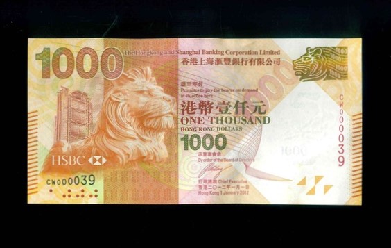 2012 香港上海滙豐銀行 $1000 UNC 編號:CW000039(有微Teller Mark)