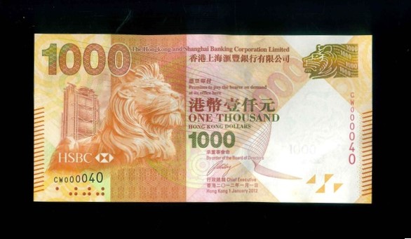 2012 香港上海滙豐銀行 $1000 UNC 編號:CW000040(有微Teller Mark)