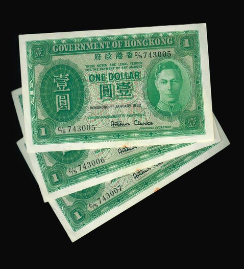1952 香港政府 $1 UNC 編號:C/5 743005-07(共3張,連號)