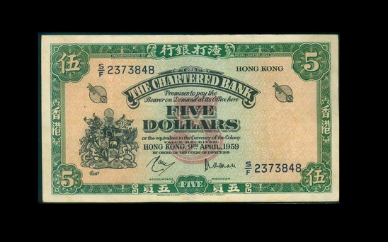 1959 香港渣打銀行 $5 EF 編號:S/F 2373848