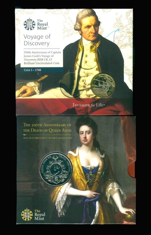 2014/2018 英國安妮女皇在位紀念£5/航海家庫克船長 £2 (未流通) 品相如圖 編號: NIL(共2套)
