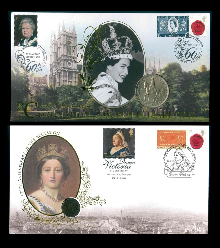 2012/2013 英國維多利亞女皇175年登基/ 伊利莎伯二世在位60年錢幣(5Schillng) 首日封 品相如圖 編號: NIL(共2套)