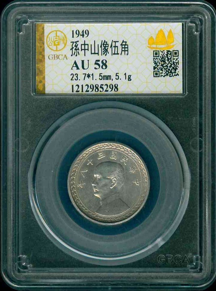 1949 中華民國38年孫中山像伍角 GBCA AU58 編號: 1212985298