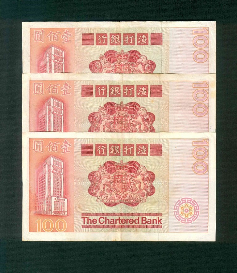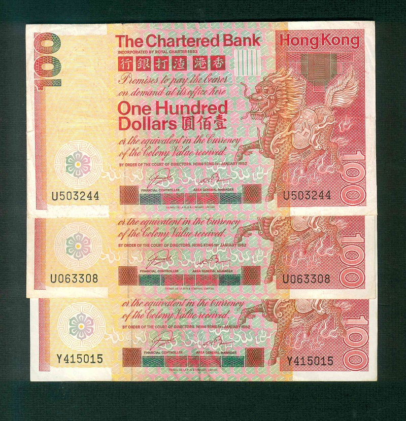 1982 香港渣打銀行 $100 VF 編號: U503244…(共3張)