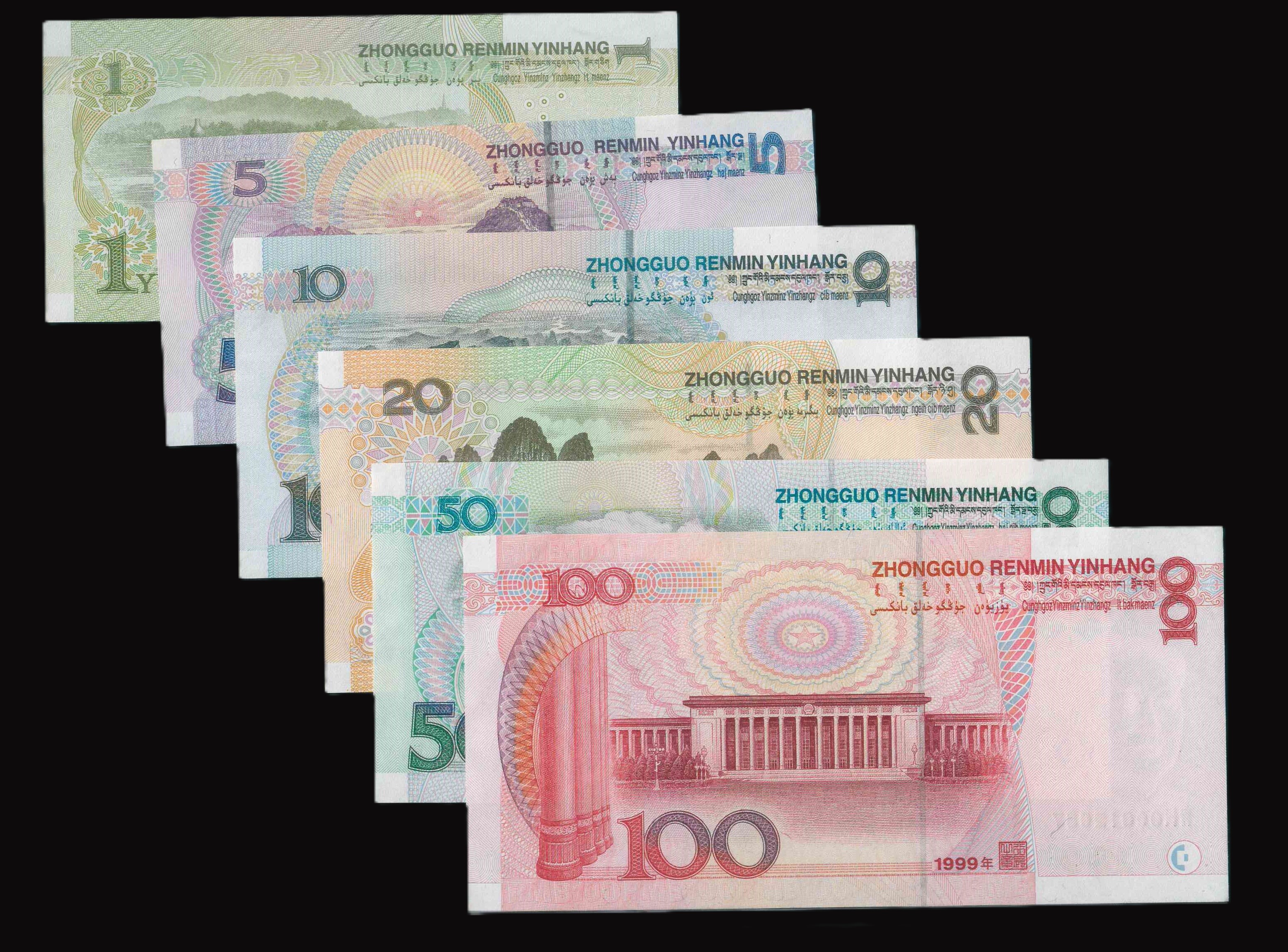 1999 中國人民銀行 $1-$100 UNC 編號: WH/CG/BC/JD/EG/CM 00012037(共6張,全同號)