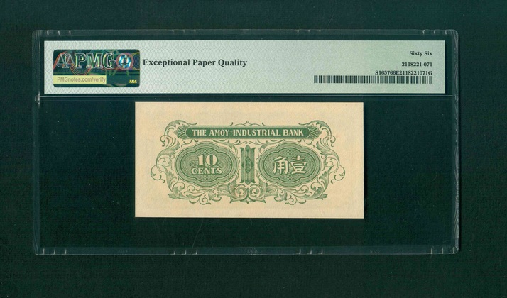 1940 廈門勸業銀行 壹角 PMG 66 EPQ 編號: A365046C(頂級雪白)