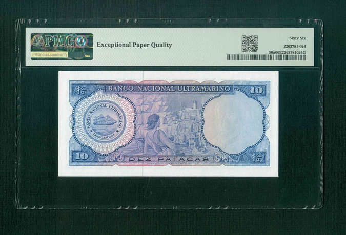 1963 澳門大西洋國海外滙理銀行 10 Patacas PMG 66 EPQ 編號: 5506757(頂級雪白)