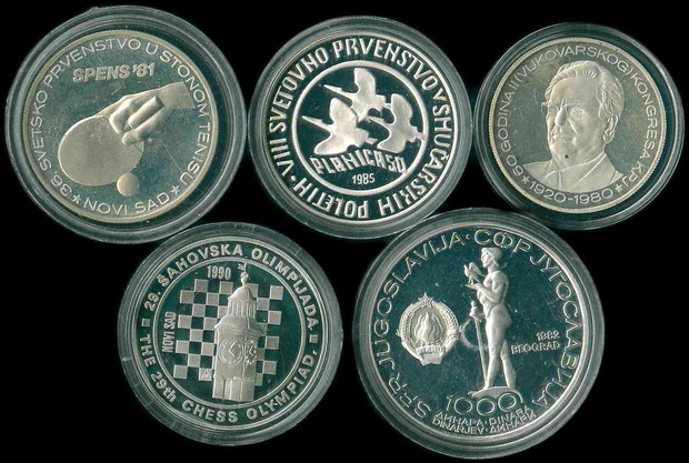 1980-1990 南斯拉夫紀念幣 100,500,1000 Dinara Proof 編號: NIL(共5枚)