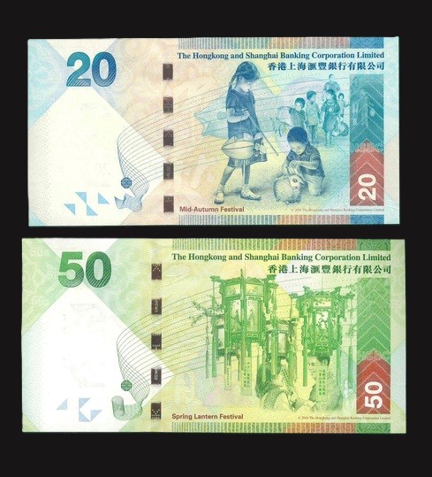 2010/2016 香港上海滙豐銀行 $20 $50 UNC 編號: FM/CV 000087(共2張,同號)