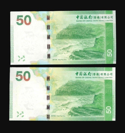 2015 香港中國銀行 $50 UNC 編號: CV000788-789(共2張,連號)