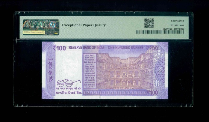 2022 印度 100 Rupees PMG 67 EPQ 編號:5PE 000002(2號仔,頂級雪白)