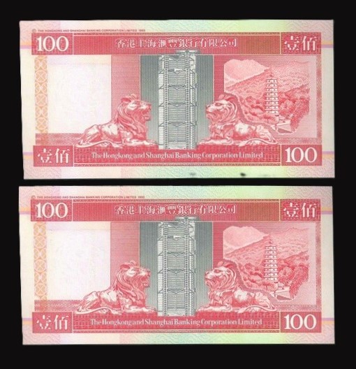 1999 香港上海匯豐銀行$100 UNC 編號: GE055551-552(連號,頂級雪白,共2張)