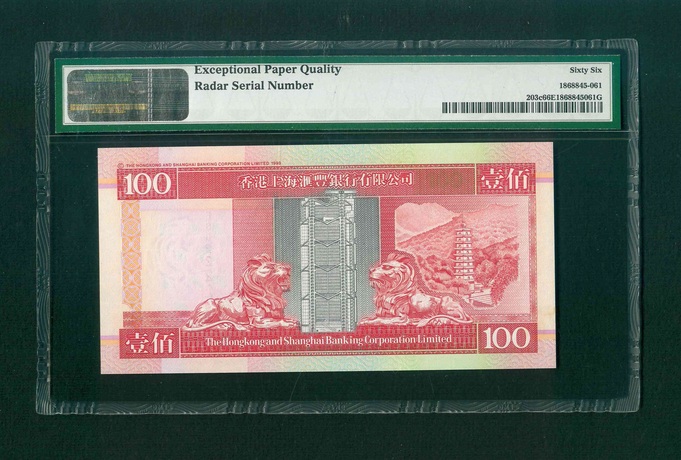 1999 香港上海匯豐銀行$100 PMG 66 EPQ 編號: ES822228(雷達號,頂級雪白)