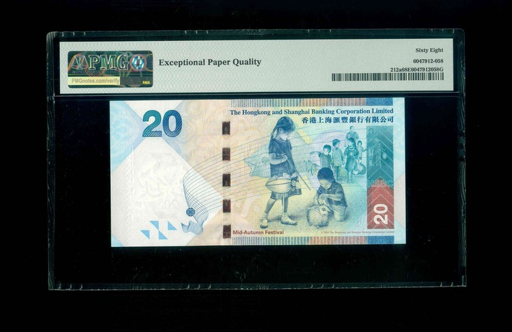 2010 香港上海滙豐銀行 $20 PMG 68 EPQ 編號:DH000077(細號三對子,頂級雪白)
