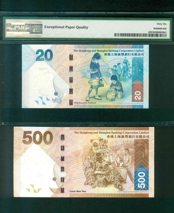 2016 香港上海滙豐銀行 $20 $500 PMG 66 EPQ/AU-UNC 編號:WQ737733/RE377737(共2張,趣味二字鈔)