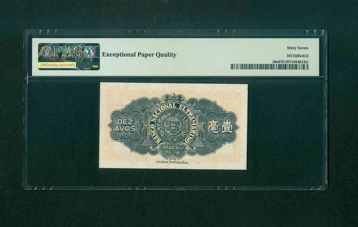 1946 澳門大西洋海外滙理銀行 10 Avos PMG 67 EPQ 編號:Remainder