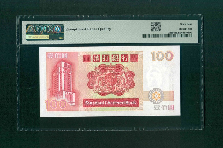 1987 香港渣打銀行 $100 PMG 64 EPQ 編號:AT875951(頂級雪白)