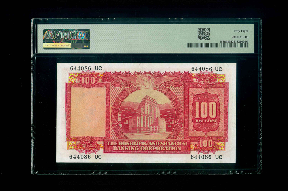 1959 香港上海匯豐銀行$100 PMG 58 編號: 644086UC