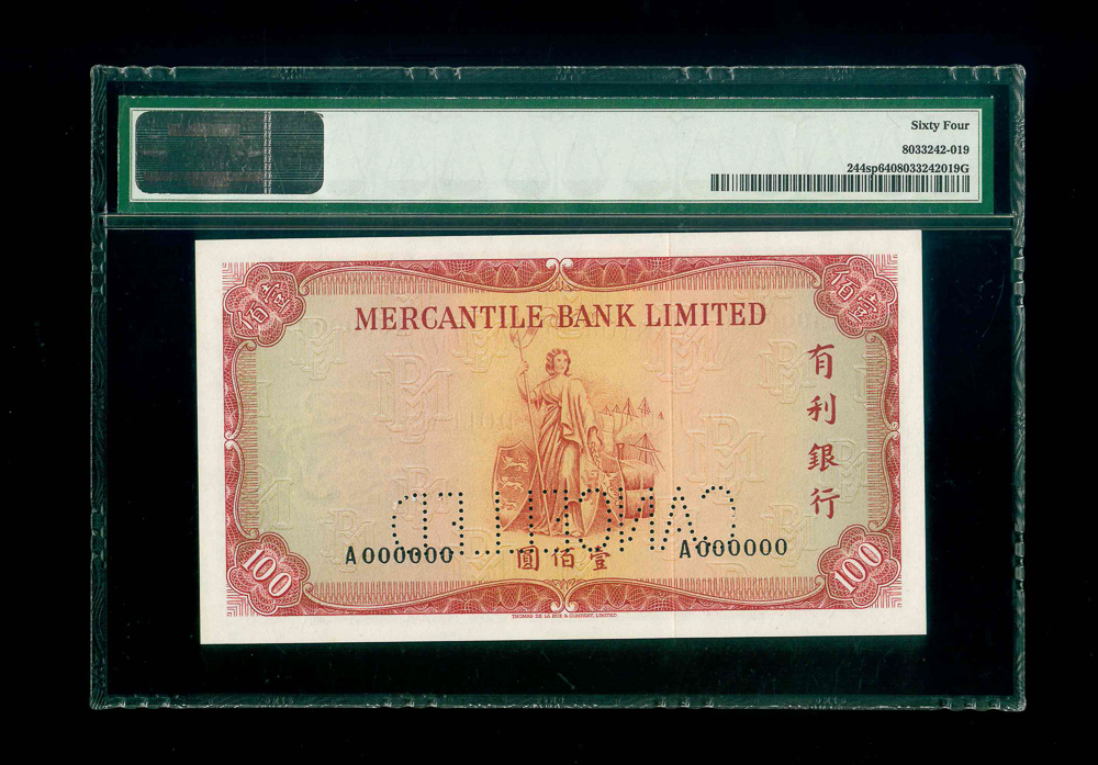 1964 香港有利銀行$100 PMG 64 編號: A000000, 少有樣票