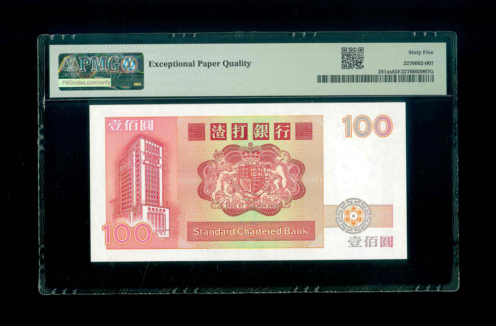 1985 香港渣打銀行$100 PMG 65 EPQ 編號: A000000 484/8,罕有雙面核對樣鈔, 品相完美無瑕