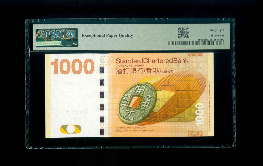 2010 香港渣打銀行$1000 PMG 68 EPQ 編號: AA510128, 高分頭版