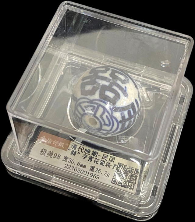 清代晚期 民國 "囍"字青花瓷珠子 金盾評級 極美98 編號:22302001969[非公博評級,自行判斷,售後不退]