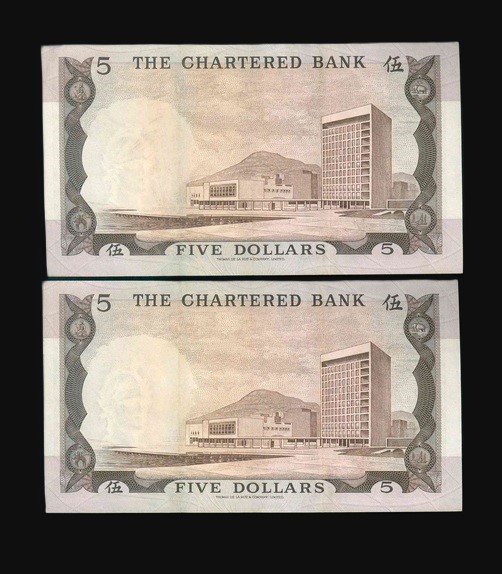 1975ND 香港渣打銀行 $5 EF 編號:A0522601-02(共2張,連號)