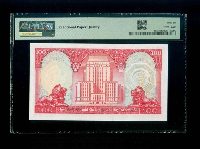 1977 香港上海滙豐銀行 $100 PMG 66 EPQ 編號:622444 XJ(豹子號,頂級雪白)
