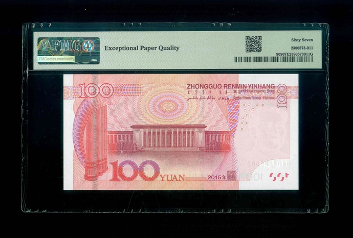 2015 中國人民銀行 $100 PMG 67 EPQ 編號:B403E88888(幸運全8,頂級雪白)
