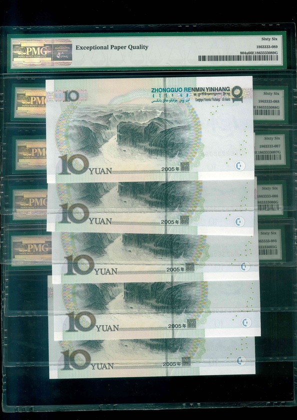 2005 中國人民銀行 $10 PMG 66-67 EPQ 編號:0163238091-95(共5張數字冠,連號,頂級雪白)