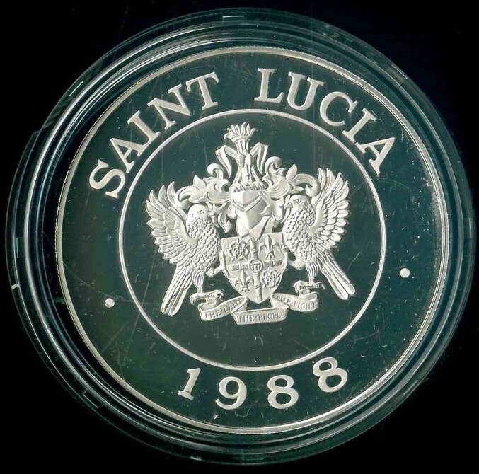 1988 Saint Lucia(聖露西亞-亞馬遜鸚鵡銀幣) $100 (3.854oz Asw 129.59g .925 Silver) UNC 編號:NIL