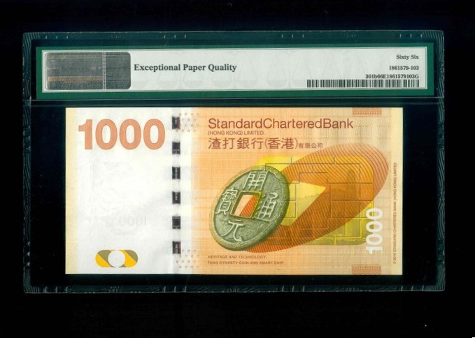 2012 香港渣打銀行$1000 PMG 66 EPQ 編號: BB846163(雙冠,頂級雪白)