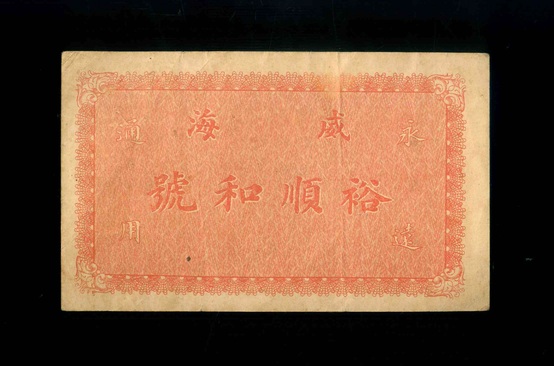 中國山東威海裕順和號 壹仟文 錢莊票