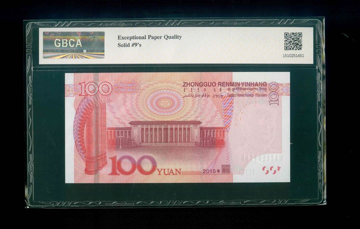 2015 中國人民銀行$100 GBCA 67 EPQ 編號: U68K999999(全9,頂級雪白)