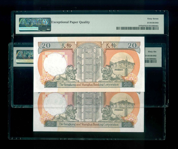 1991 香港上海滙豐銀行 $20 PMG 66-67 EPQ 編號:CC000656-57(共2張,雙冠連號,頂級雪白)