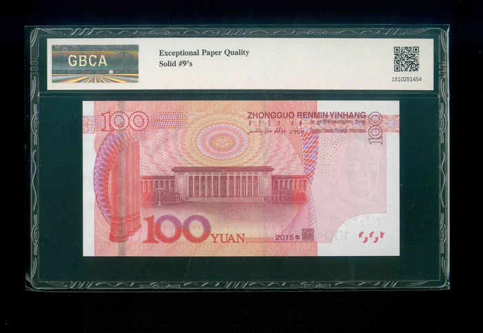 2015 中國人民銀行 $100 GBCA 66 EPQ 編號:K58P999999(幸運全9,頂級雪白)
