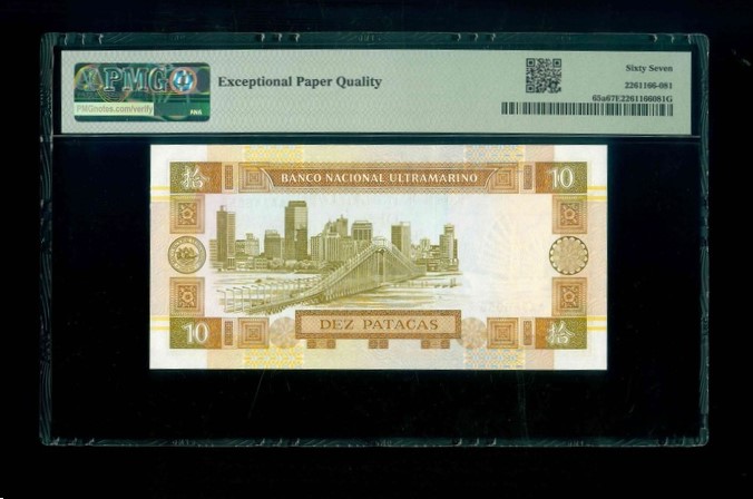 1991 澳門大西洋銀行 10 Patacas PMG 67 EPQ 編號:AA746056(頭版系列,頂級雪白)