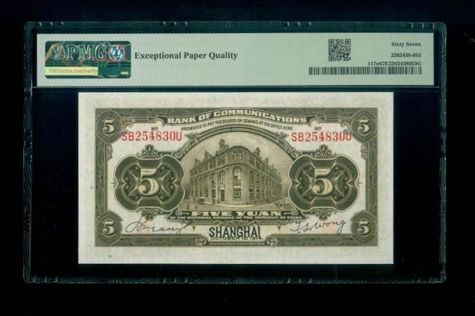 1914 上海交通銀行 $5 PMG 67 EPQ 編號:SB254830U(頂級雪白)