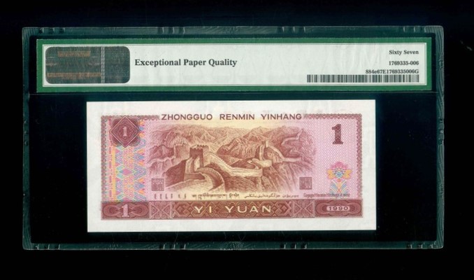 1990 中國人民銀行 $1 PMG 67 EPQ 編號:KU21151910(頂級雪白)