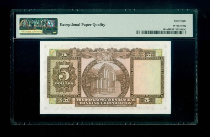 1972 香港上海滙豐銀行 $5 PMG 68 EPQ 編號591762 EJ(頂級雪白)