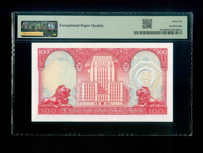 1981 香港上海滙豐銀行 $100 PMG 66 EPQ 編號:UB 836888(豹子號,頂級雪白)