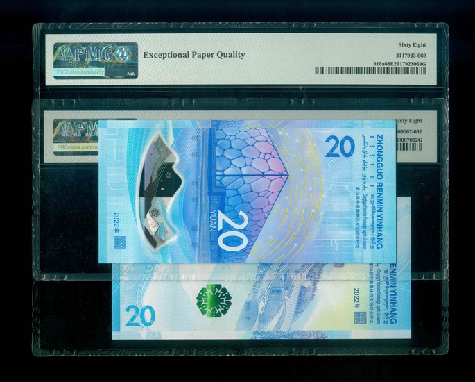2022 中國人民銀行北京冬奧紀念鈔 $20 PMG 68 EPQ 編號:J391600652…(共2張,預級雪白)
