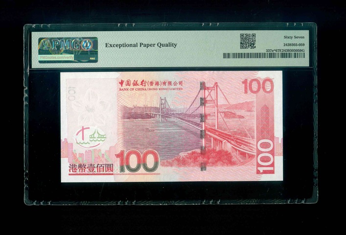 2008 香港中國銀行 $100 PMG 67 EPQ 編號:ZY594429(補版系列,頂級雪白)