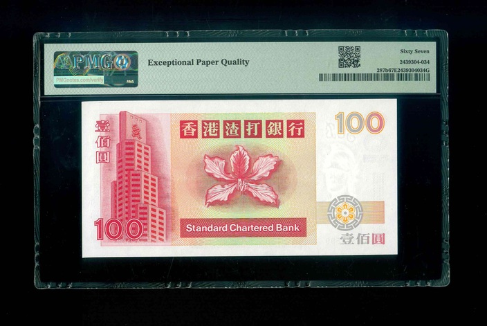 1996 香港渣打銀行 $100 PMG 67 EPQ 編號:CE335599(三對子,頂級雪白)