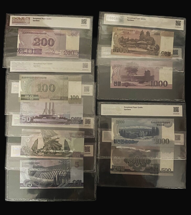 2002/2008 韓國 5-5000 Won GBCA 67 EPQ 編號:GV 0000000…(共9張,樣鈔,頂級雪白)